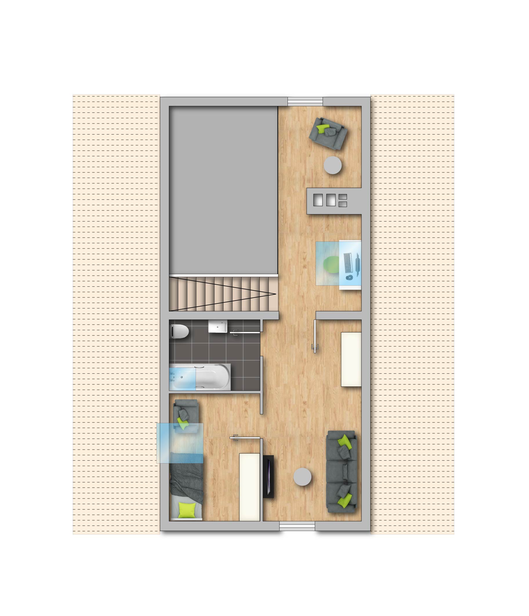 Hervorragend für einen Teenager bietet die Galerie mit ihrem ausgebauten Spitzboden ein eigenes Reich für Wohnen und Schlafen. Ein Durchgangszimmer sowie ein Schlafraum integrieren sich hervorragend, passend dazu ein Wannenbad mit Tageslichtfaktor.