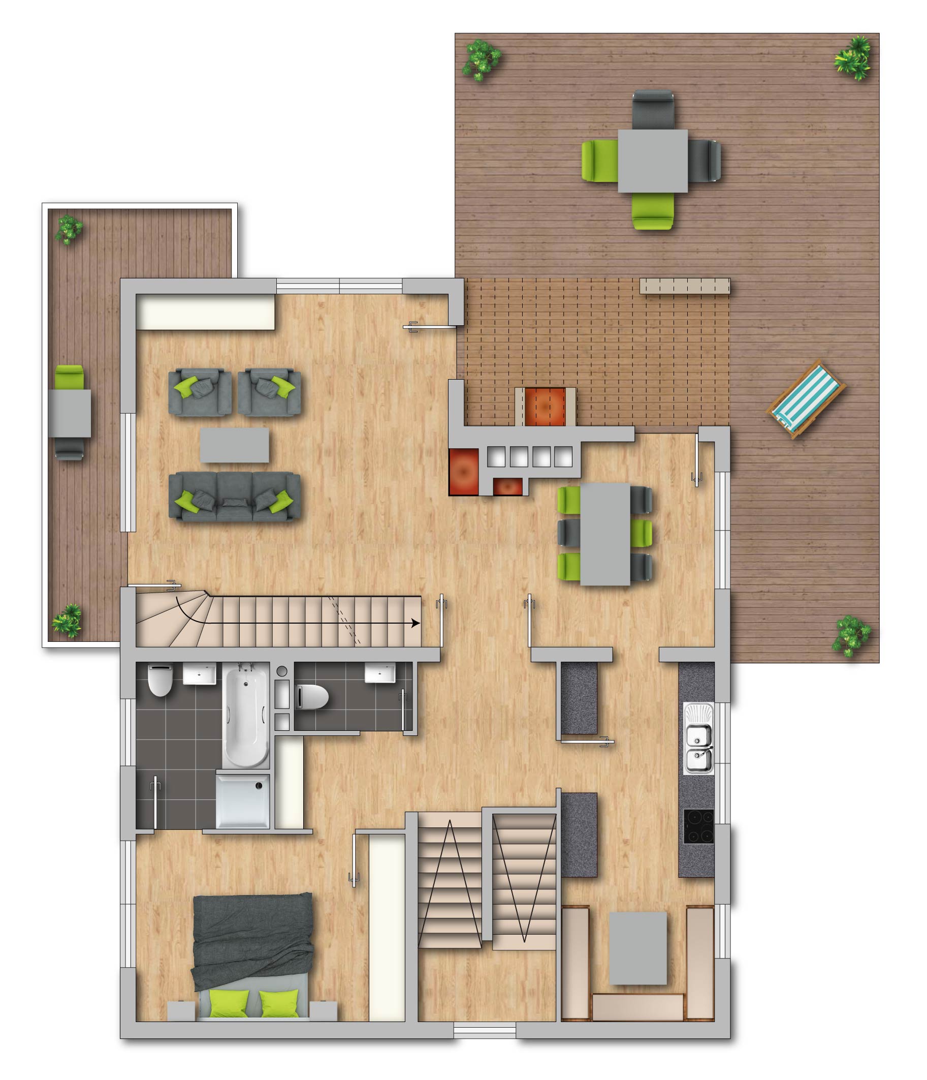 Das Hauptgeschoss ist sehr großzügig geschnitten und beeindruckt durch ein offenes Wohnen und Essen, dessen Höhe durch die integrierte Galerie optisch ein Augenmerk ist. Im Nordostbereich ist ein umlaufender Balkon integriert. Der Küchenbereich ist separat geschnitten.