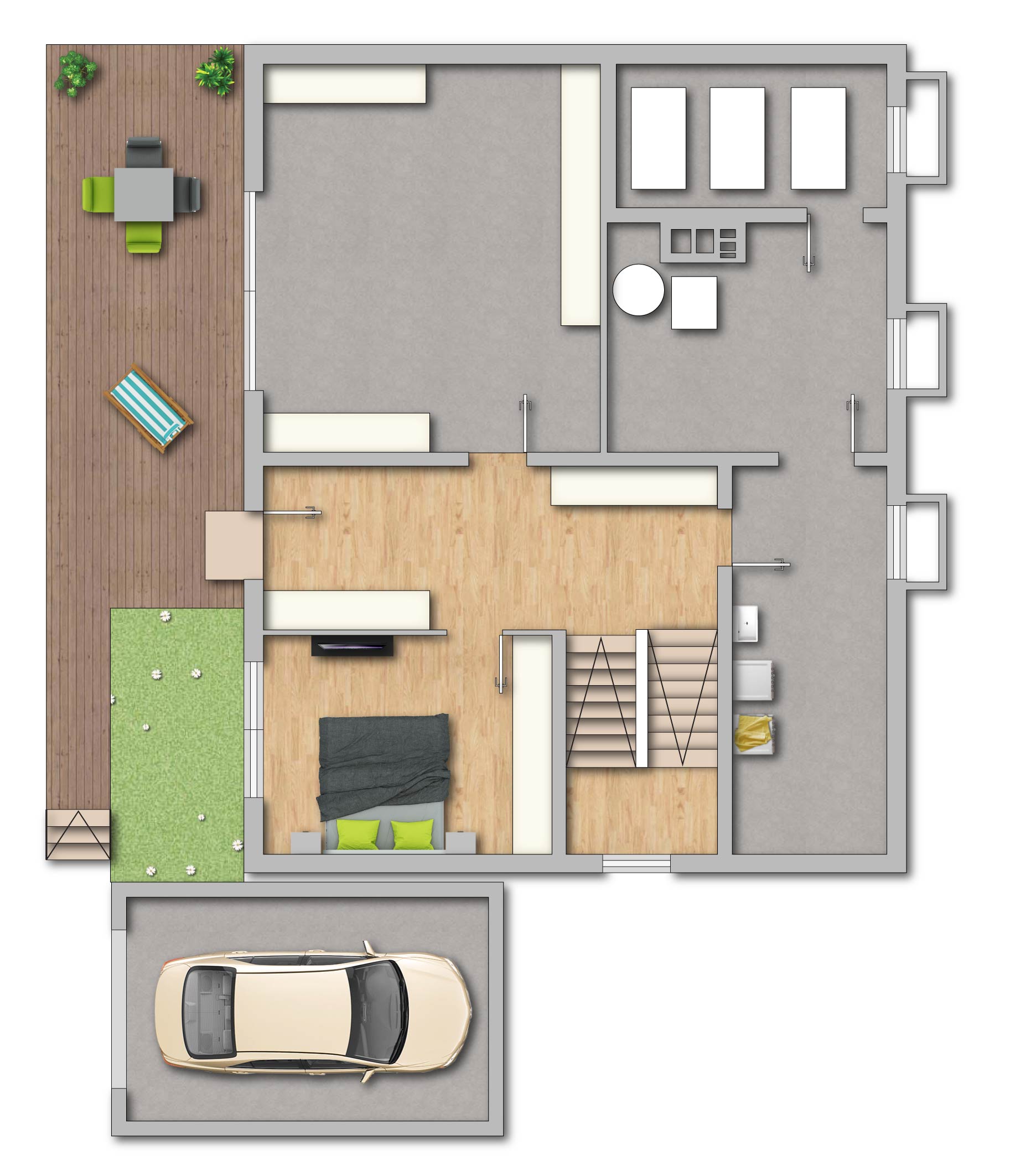 Der Hauseingang befindet sich durch die Hanglage im Souterrain. Neben einem Gästezimmer und einem nicht ausgebauten Raum ergänzen ein Hauswirtschafts- und Technikraum die Etage.