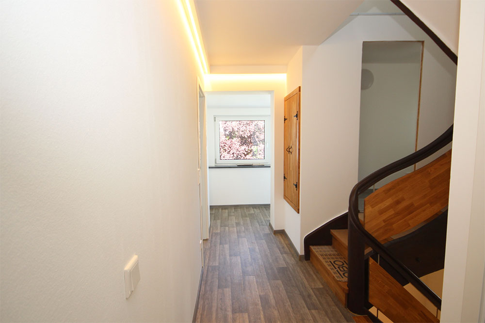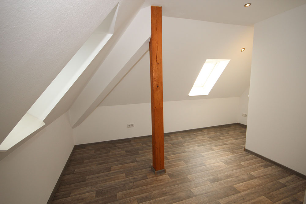 Die Wohnung selbst befindet sich über zwei Etagen im 1. Obergeschoss und im Spitzboden. Durch das eigene Treppenhaus wirkt der Flur großzügig und frei.
