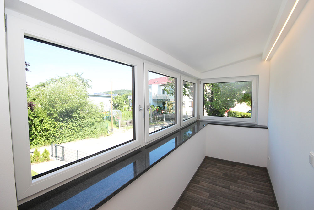 Ebenfalls vom Flur aus sind der kleine aber feine Wintergarten mit großzügigen Fensterflächen und das moderne Duschbad zu erreichen.