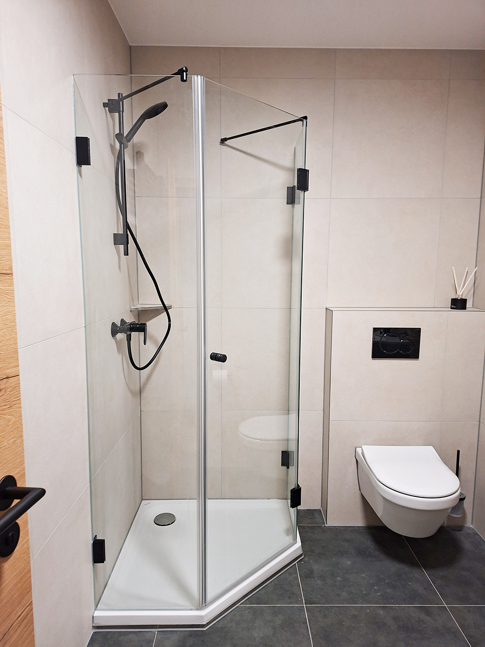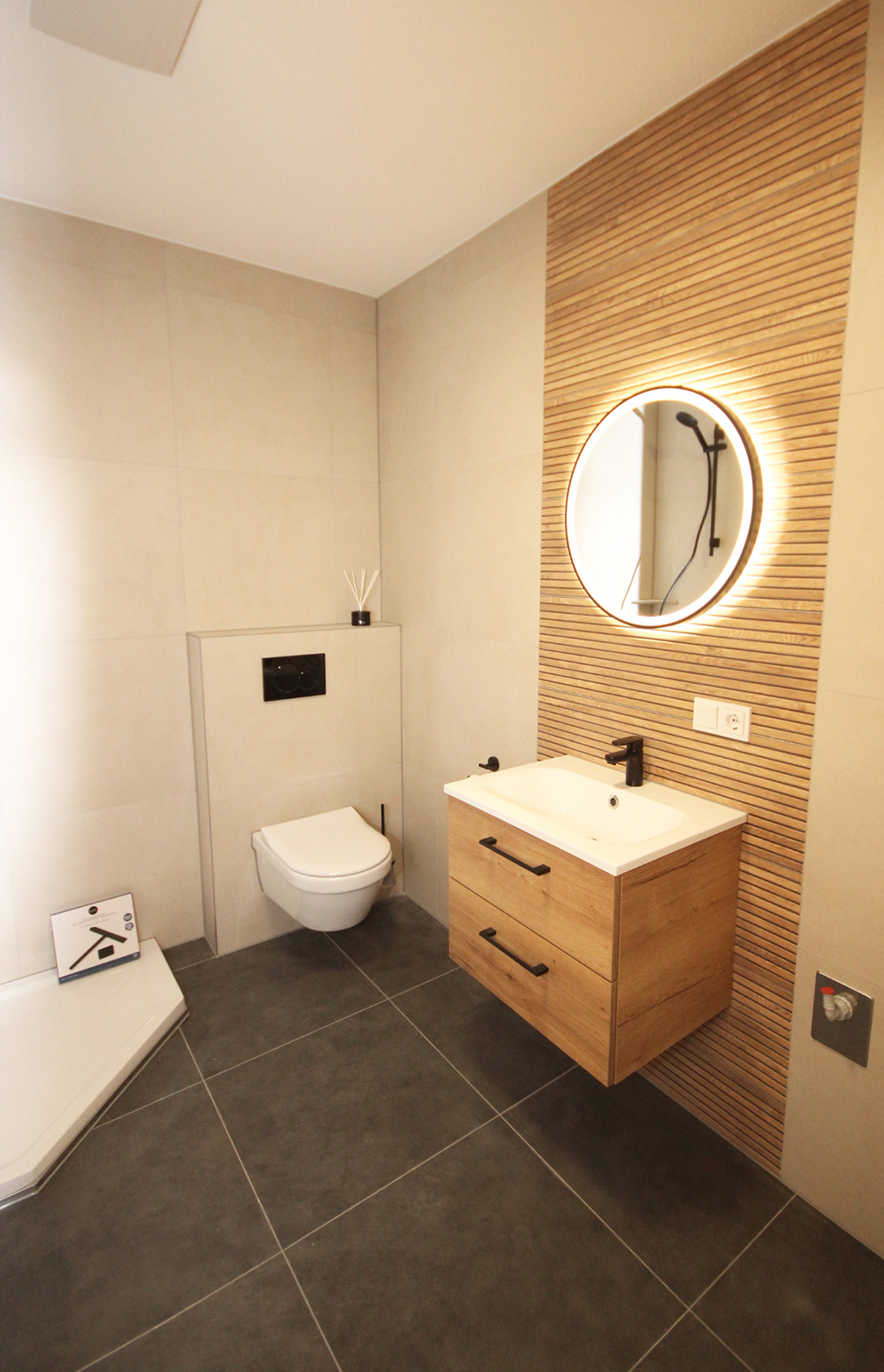 • Bad mit Waschtisch, beleuchtetem Spiegel, Klarglasdusche und Handtuchheizkörper