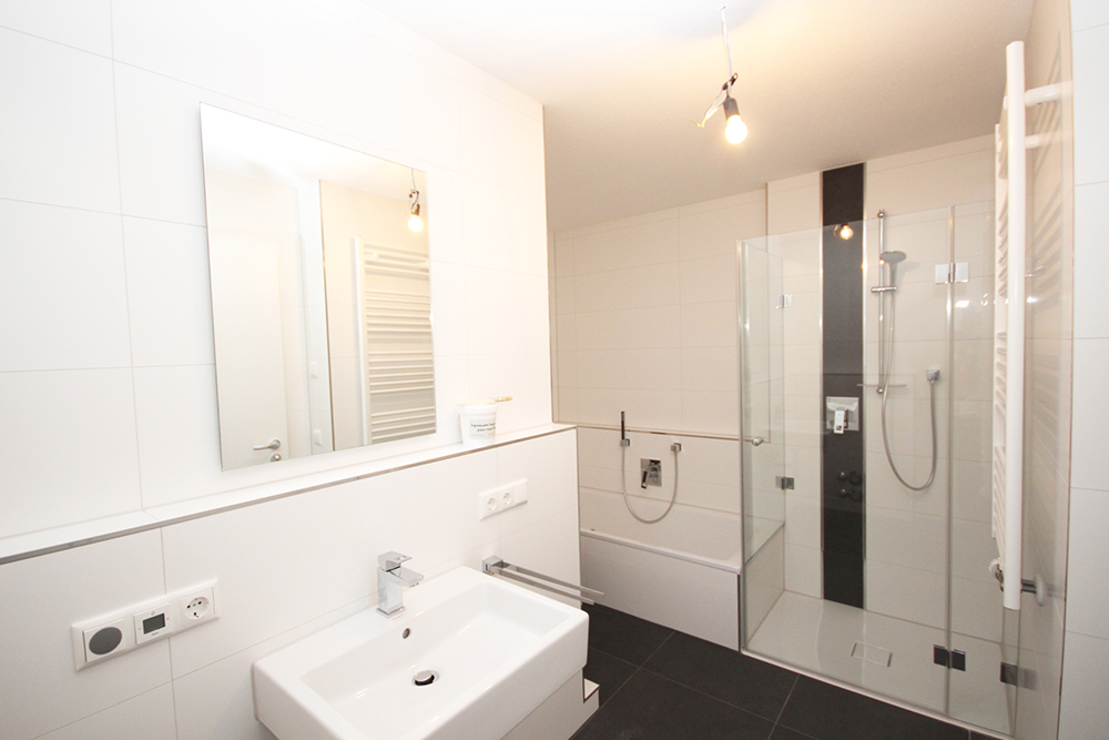 • Flachduschwanne / Ganzglasdusche, rahmenlos und Handtuchheizkörper im Bad