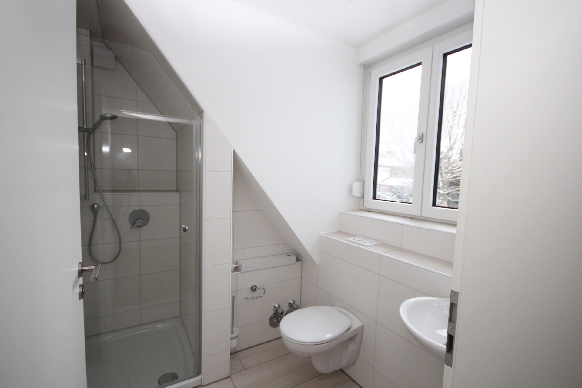 Die Wohnung liegt im 1. Obergeschoss (= Dachgeschoss) und ist nach Westen ausgerichtet.